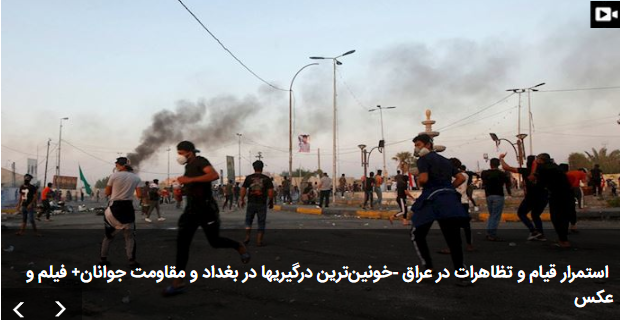 قیام مردمی در بغداد و سایر شهرهای عراق شعله می کشد و صبح چهارشنبه جوانان شورشی با درگیریهای گسترده در میدان خلانی بغداد به مصاف نیروهای تا دندان مسلح و وحوش خامنه ای رفتند.